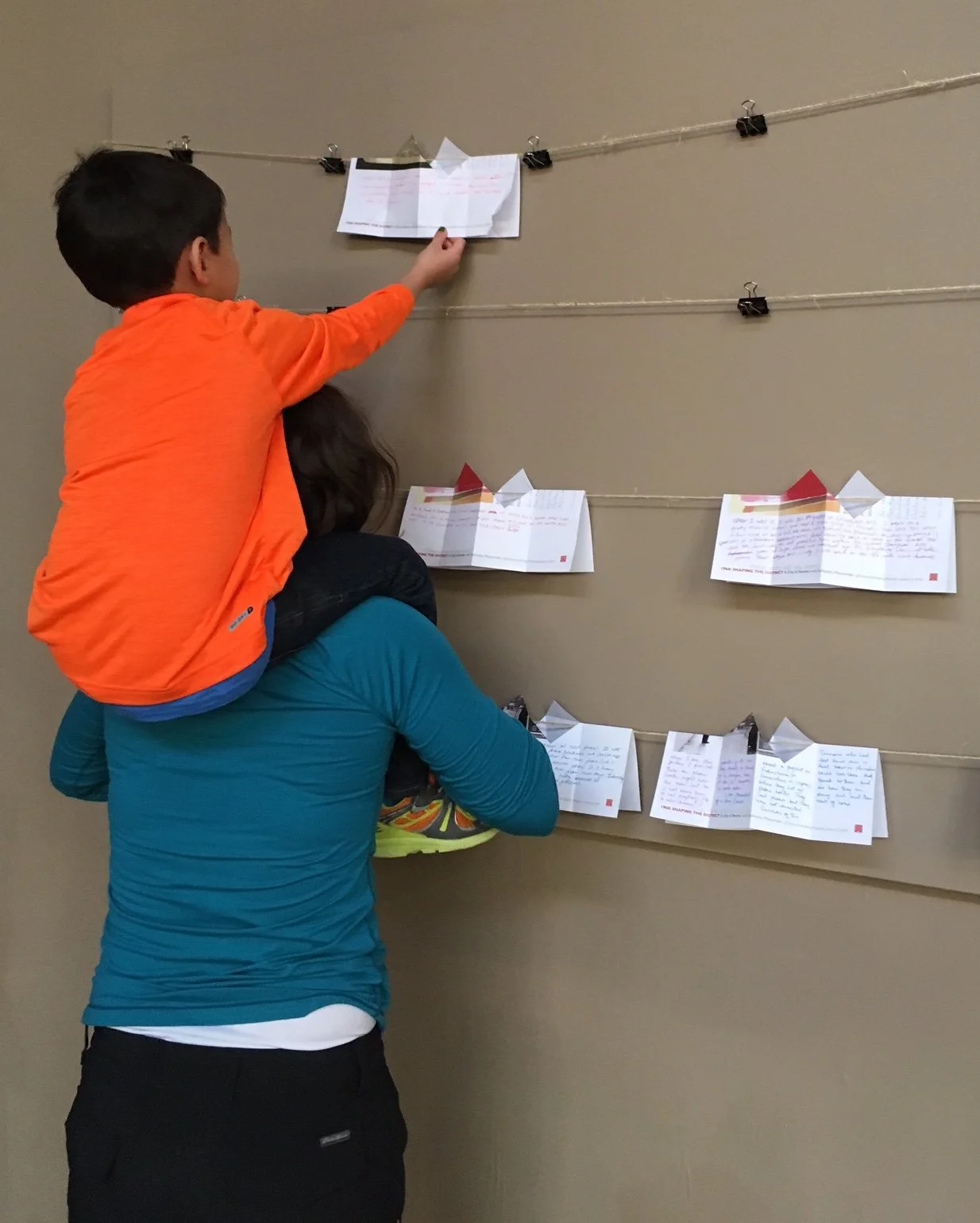 One weekend, we invited visitors to respond to the photo from the exhibit or the story of the PAUSEr. We taught them how the StoryPage became a house-shaped book and let them write. Then add it to the display. Visitors wrote in various scripts/languages. There were many multi-generational groups who participated. We did not ask them to translate as many were clearly emotional about their writing.