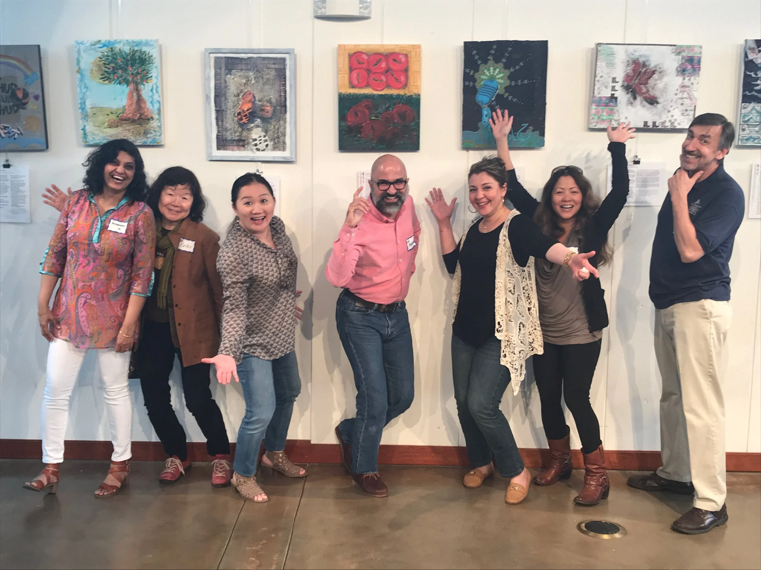 Photos: Top - The OST staff, seeing the books made by their students on display, UUCA exhibit, 2018 • PAUSErs with the art Sushmita made inspired by their stories, UUCA exhibit, 2018 • OST staff with their stories and art on display at the UUCA exhibit, 2018 • The City of Stories installation, Kenmore Middle School, Arlington VA 2018.