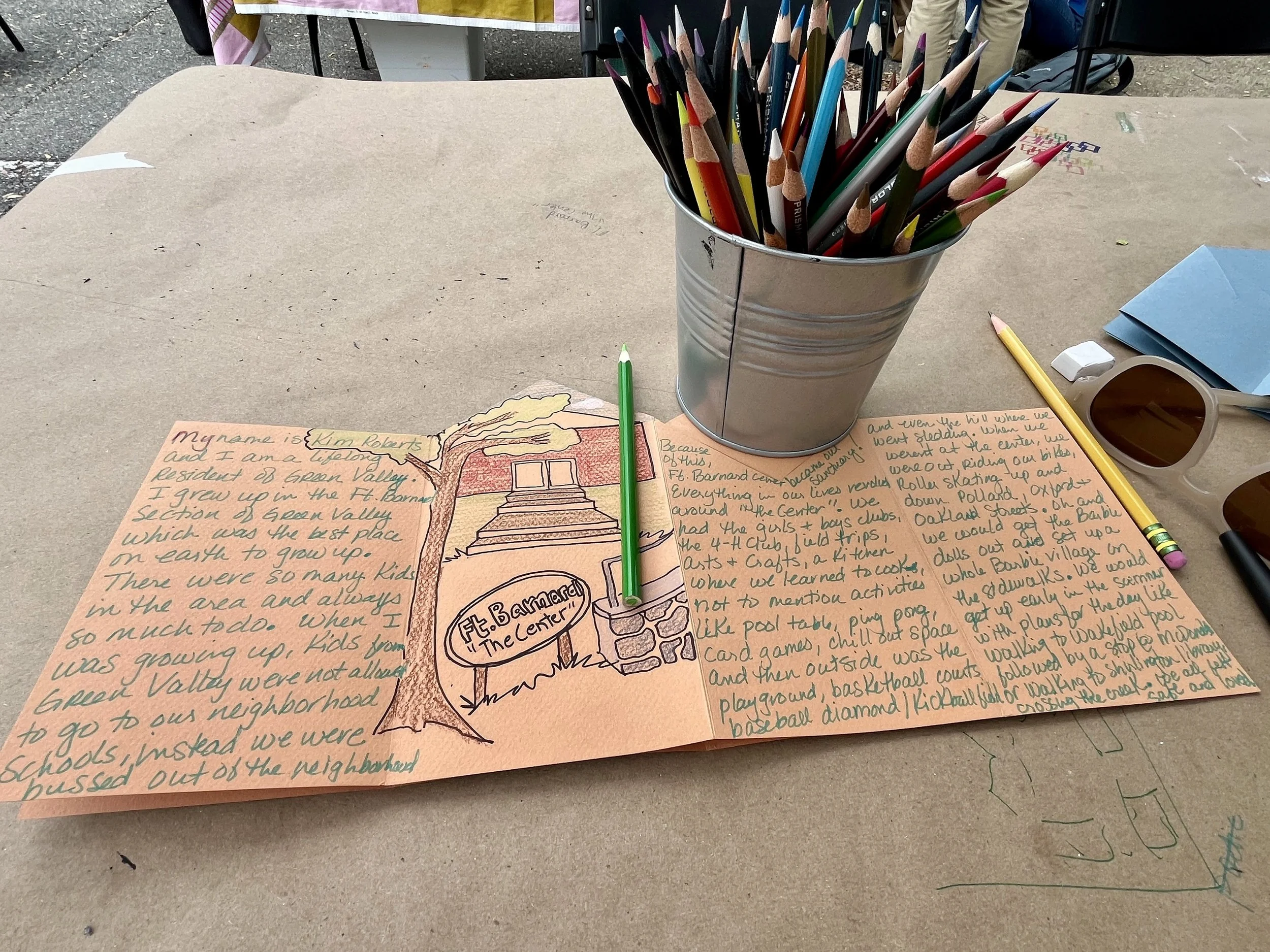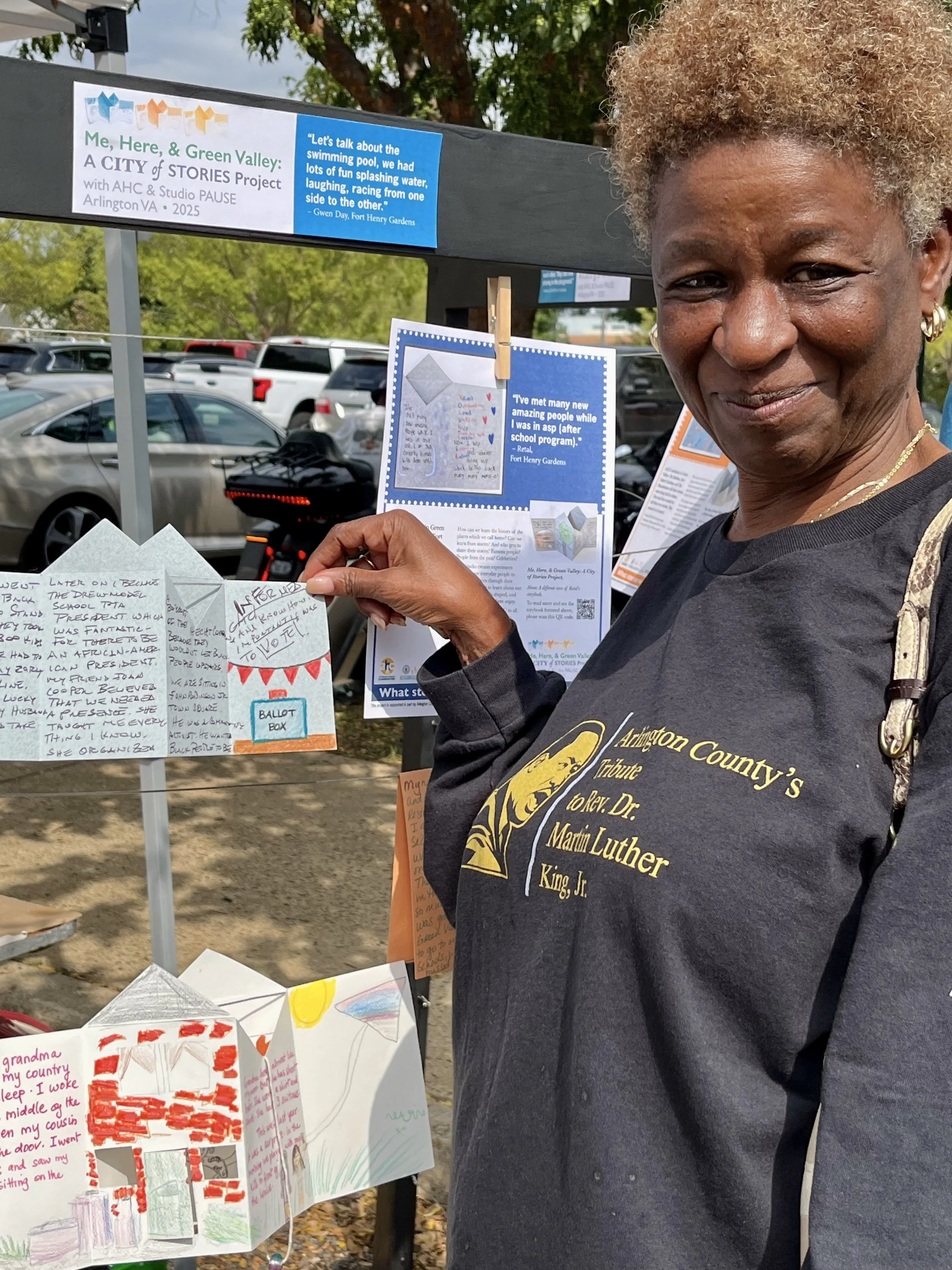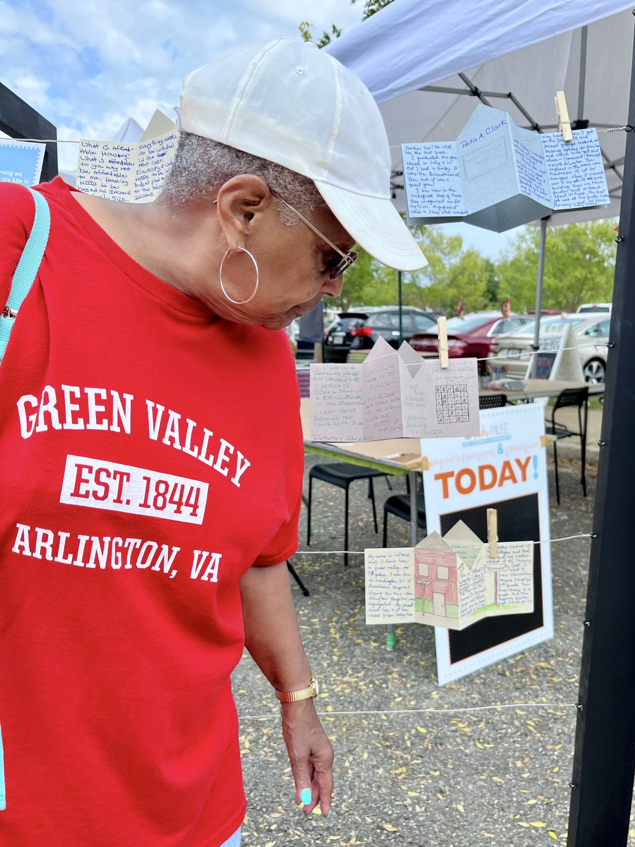 The final display of the complete “City of Stories: Me, Here, & Green Valley” was presented at Green Valley Day on September 20th, 2025, 12-5 pm, at Dr. Charles Drew Elementary School, 3500 S. 23rd St., Arlington VA 22206 (organized by the Green Valley Civic Association). It was wonderful to see residents stop by to see their stores, and others stop by eagerly to complete the stories that they started. New people came by to share stories including Dr. Alfred O. Taylor Jr., the notable historian, author, and community activist from Green Valley!